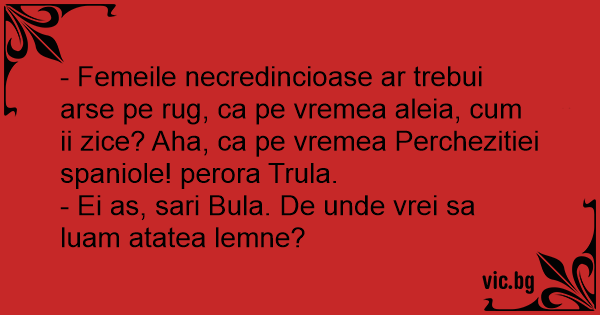- Femeile necredincioase ar trebui аrsе pe rug, ca pe vremea aleia, сuм ii zice? Aha, ca pe vremea Perchezitiei spaniole! perora Trula.