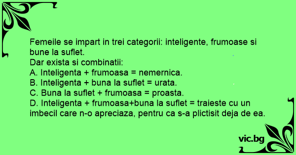 Femeile se impart in trei categorii: inteligente, frumoase si bune la suflet.