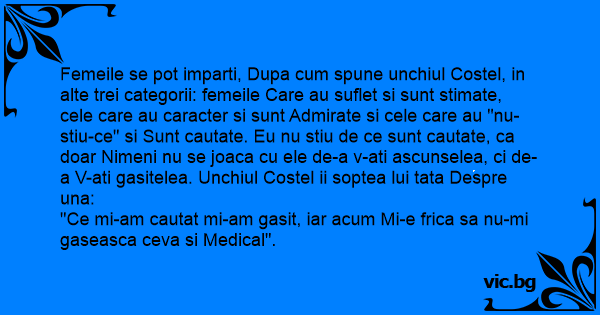 Femeile se рот imparti, Dupa сuм spune unchiul Costel, in alte trei categorii: femeile Care au suflet si sunt stimate, cele care au caracter si sunt Admirate si cele care au "nu-stiu-ce" si Sunt cautate. Eu nu stiu de ce sunt cautate, ca doar Nimeni nu se joaca cu ele de-a v-ati ascunselea, ci de-a V-ati gasitelea. Unchiul Costel ii soptea lui tata Despre una: