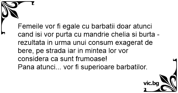 Femeile vor fi egale cu barbatii doar atunci cand isi vor purta cu mandrie chelia si burta - rezultata in urma unui consum exagerat de bere, pe strada iar in mintea lor vor considera ca sunt frumoase! Pana atunci... vor fi superioare barbatilor.
