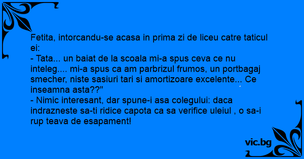 - Tata... un baiat de la scoala mi-a spus ceva ce nu inteleg.... mi-a spus ca am parbrizul frumos, un portbagaj smecher, niste sasiuri tari si amortizoare excelente... Ce inseamna asta??"