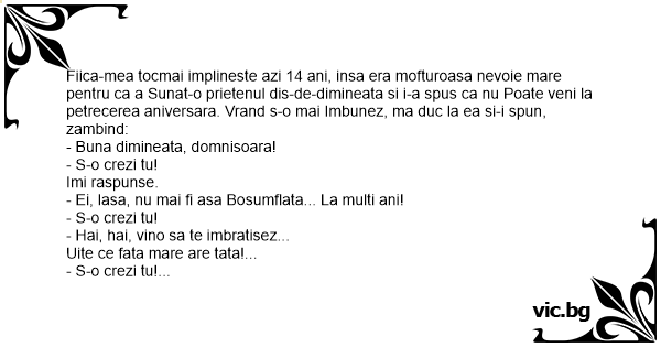 Fiica-mea tocmai implineste azi 14 ani, insa era mofturoasa nevoie mare pentru ca a Sunat-o prietenul dis-de-dimineata si i-a spus ca nu Poate veni la petrecerea aniversara. Vrand s-o mai Imbunez, ma duc la ea si-i spun, zambind: