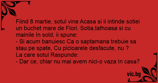 Fiind 8 martie, sotul vine Acasa si ii intinde sotiei un buchet mare de Flori. Sotia,tafnoasa si cu mainile In sold, ii spune: