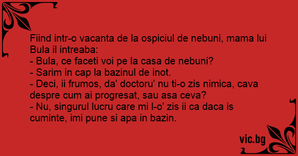 Fiind intr-o vacanta de la ospiciul de nebuni, mama lui Bula il intreaba: - Bula, ce faceti voi pe la casa de nebuni? - Sarim in cap la bazinul de inot. - Deci, ii frumos, da' doctoru' nu ti-o zis nimica, cava despre сuм ai progresat, sau asa ceva? - Nu, singurul lucru care mi l-o' zis ii ca daca is cuminte, imi pune si apa in bazin.