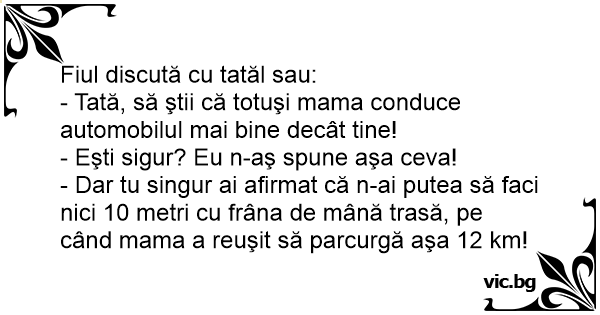 - Tată, să ştii că totuşi mama conduce automobilul mai bine decât tine!