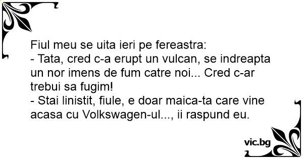 - Stai linistit, fiule, e doar maica-ta care vine acasa cu Volkswagen-ul..., ii raspund eu.