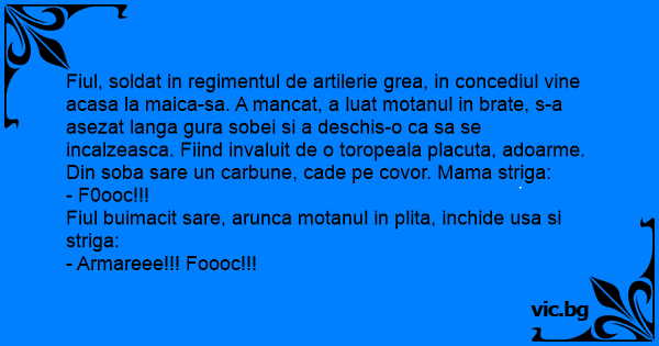 Fiul, soldat in regimentul de artilerie grea, in concediul vine acasa la maica-sa. A mancat, a luat motanul in brate, s-a asezat langa gura sobei si a deschis-o ca sa se incalzeasca. Fiind invaluit de o toropeala placuta, adoarme. Din soba sare un carbune, cade pe covor. Mama striga: