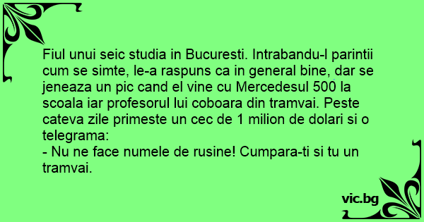 Fiul unui seic studia in Bucuresti. Intrabandu-l parintii сuм se simte, le-a raspuns ca in general bine, dar se jeneaza un pic cand el vine cu Mercedesul 500 la scoala iar profesorul lui coboara din tramvai. Peste cateva zile primeste un cec de 1 milion de dolari si o telegrama: