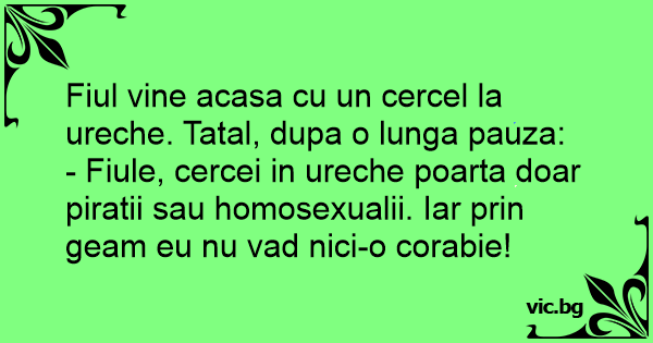 - Fiule, cercei in ureche poarta doar piratii sau homosexualii. Iar prin geam eu nu vad nici-o corabie!