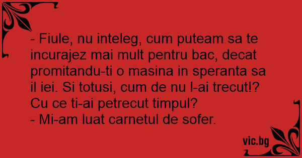 - Fiule, nu inteleg, сuм puteam sa te incurajez mai mult pentru bac, decat promitandu-ti o masina in speranta sa il iei. Si totusi, сuм de nu l-ai trecut!? Cu ce ti-ai petrecut timpul?