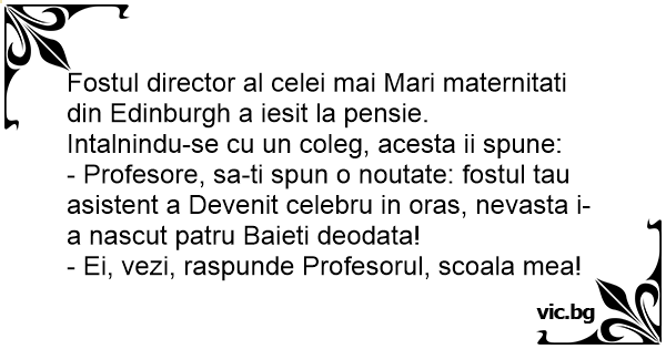 - Profesore, sa-ti spun o noutate: fostul tau asistent a Devenit celebru in oras, nevasta i-a nascut patru Baieti deodata!