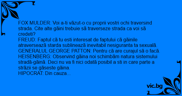 FOX MULDER: Voi a-ti vãzut-o cu proprii vostri ochi traversind strada. Cite alte gãini trebuie sã traverseze strada ca voi sã credeti?
