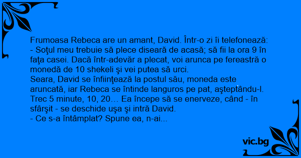 - Soţul meu trebuie să plece diseară de acasă; să fii la ora 9 în faţa casei. Dacă într-adevăr a plecat, voi arunca pe fereastră o monedă de 10 shekeli şi vei putea să urci.