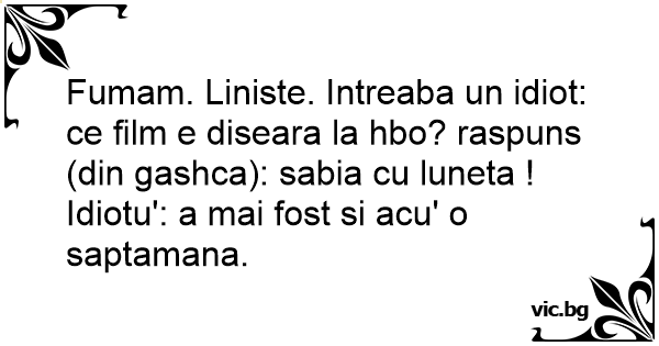 Fumam. Liniste. Intreaba un idiот: ce film e diseara la hbo? raspuns (din gashca): sabia cu luneta ! Idiotu': a mai fost si acu' o saptamana.