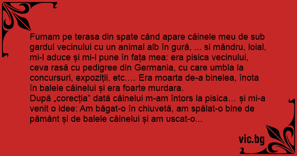 După „corecția” dată câinelui m-am întors la pisica… și mi-a venit o idee: Am băgat-o în chiuvetă, am spălat-o bine de pământ și de balele câinelui și am uscat-o cu uscătorul de păr al neveste-mi. Apoi m-am furisat in curtea vecinului, si am pus la loc pisica in cosuletul ei. După-masă vine vecinul acasă… La vreo 5 minute se aude gălăgie, larmă, înjurături…