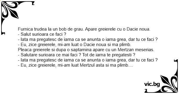 - Eu, zice greierele, mi-am luat o Dacie noua si ma plimb.