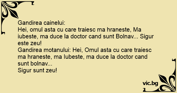 Hei, omul asta cu care traiesc ma hraneste, Ma iubeste, ma duce la doctor cand sunt Bolnav... Sigur este zeu!