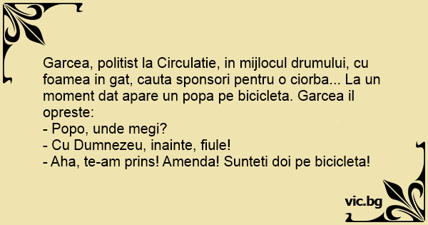 Garcea, politist la Circulatie, in mijlocul drumului, cu foamea in gat, cauta sponsori pentru o ciorba... La un moment dat apare un popa pe bicicleta. Garcea il opreste: