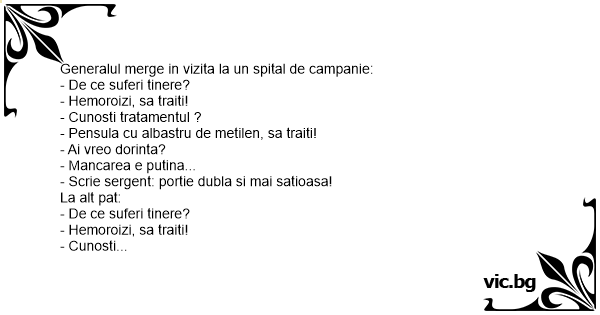 Si tot asa urmeaza inca vreo cativa pacienti, bolnavi de hemoroizi. Intr-un colt al salonului statea unul pricajit, vai de mama lu: