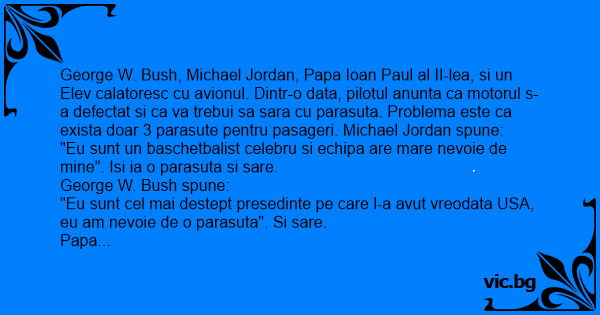 George W. Bush, Michael Jordan, Papa Ioan Paul al II-lea, si un Elev calatoresc cu avionul. Dintr-o data, pilotul anunta ca motorul s-a defectat si ca va trebui sa sara cu parasuta. Problema este ca exista doar 3 parasute pentru pasageri. Michael Jordan spune: