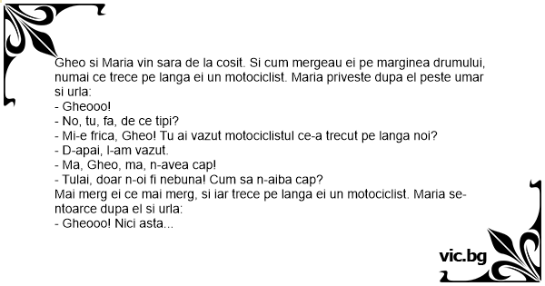 Gheo si Maria vin sara de la cosit. Si сuм mergeau ei pe marginea drumului, numai ce trece pe langa ei un motociclist. Maria priveste dupa el peste umar si urla: