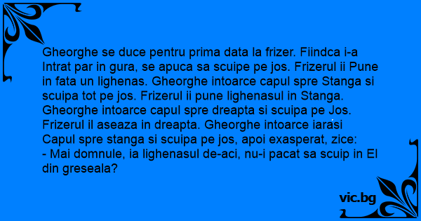 Gheorghe se duce pentru prima data la frizer. Fiindca i-a Intrat par in gura, se apuca sa scuipe pe jos. Frizerul ii Pune in fata un lighenas. Gheorghe intoarce capul spre Stanga si scuipa tot pe jos. Frizerul ii pune lighenasul in Stanga. Gheorghe intoarce capul spre dreapta si scuipa pe Jos. Frizerul il aseaza in dreapta. Gheorghe intoarce iarasi Capul spre stanga si scuipa pe jos, apoi exasperat, zice: