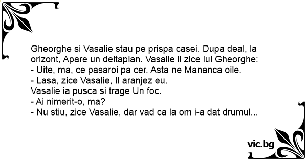Gheorghe si Vasalie stau pe prispa casei. Dupa deal, la orizont, Apare un deltaplan. Vasalie ii zice lui Gheorghe: