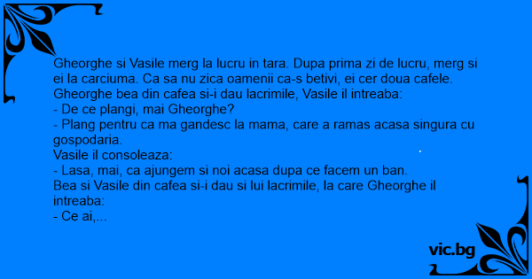 Gheorghe si Vasile merg la lucru in tara. Dupa prima zi de lucru, merg si ei la carciuma. Ca sa nu zica oamenii ca-s betivi, ei cer doua cafele. Gheorghe bea din cafea si-i dau lacrimile, Vasile il intreaba: