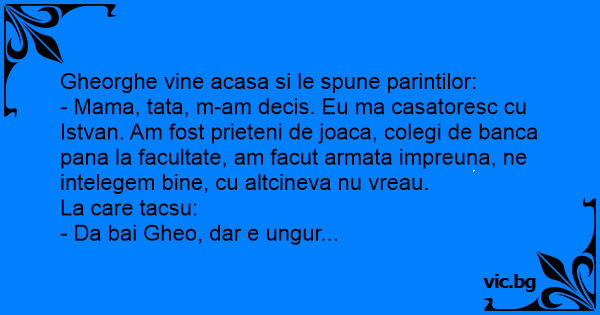 - Mama, tata, m-am decis. Eu ma casatoresc cu Istvan. Am fost prieteni de joaca, colegi de banca pana la facultate, am facut armata impreuna, ne intelegem bine, cu altcineva nu vreau.