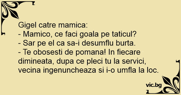 - Te obosesti de pomana! In fiecare dimineata, dupa ce pleci tu la servici, vecina ingenuncheaza si i-o umfla la loc.