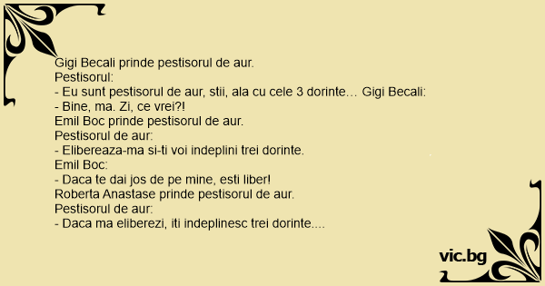 - Eu sunt pestisorul de aur, stii, ala cu cele 3 dorinte… Gigi Becali: