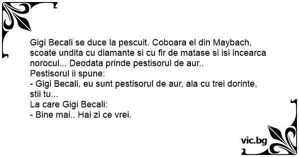 Gigi Becali se duce la pescuit. Coboara el din Maybach, scoate undita cu diamante si cu fir de matase si isi incearca norocul... Deodata prinde pestisorul de aur..