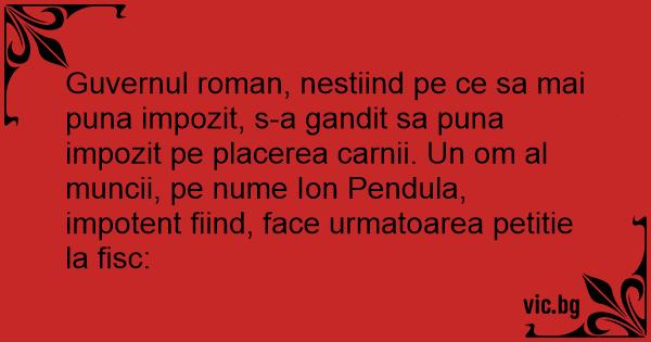Guvernul roman, nestiind pe ce sa mai puna impozit, s-a gandit sa puna impozit pe placerea carnii. Un om al muncii, pe nume Ion Pendula, impotent fiind, face urmatoarea petitie la fisc: