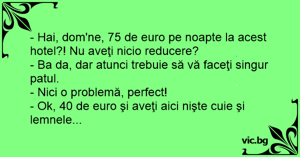 - Hai, dom'ne, 75 de euro pe noapte la acest hotel?! Nu aveţi nicio reducere?