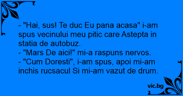 - "Hai, sus! Te duc Eu pana acasa" i-am spus vecinului meu pitic care Astepta in statia de autobuz.