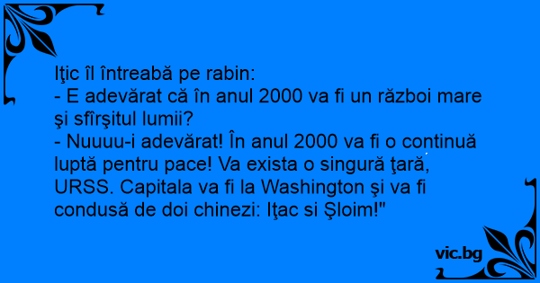 - Nuuuu-i adevărat! În anul 2000 va fi o continuă luptă pentru pace! Va exista o singură ţară, URSS. Capitala va fi la Washington şi va fi condusă de doi chinezi: Iţac si Şloim!"