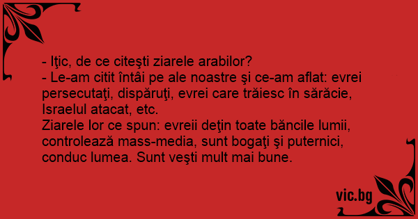 Ziarele lor ce spun: evreii deţin toate băncile lumii, controlează mass-media, sunt bogaţi şi puternici, conduc lumea. Sunt veşti mult mai bune.