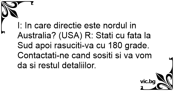 I: In care directie este nordul in Australia? (USA) R: Stati cu fata la Sud apoi rasuciti-va cu 180 grade.