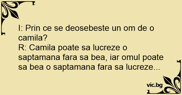 R: Camila poate sa lucreze o saptamana fara sa bea, iar omul poate sa bea o saptamana fara sa lucreze...