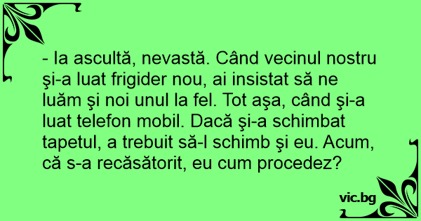 - Ia ascultă, nevastă. Când vecinul nostru şi-a luat frigider nou, ai insistat să ne luăm şi noi unul la fel. Tot aşa, când şi-a luat telefon mobil. Dacă şi-a schimbat tapetul, a trebuit să-l schimb şi eu. Acum, că s-a recăsătorit, eu сuм procedez?