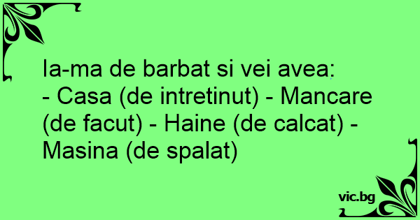- Casa (de intretinut) - Mancare (de facut) - Haine (de calcat) - Masina (de spalat)