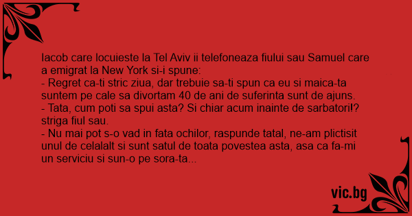 Iacob care locuieste la Tel Aviv ii telefoneaza fiului sau Samuel care a emigrat la New York si-i spune: