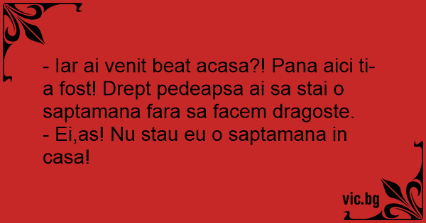 - Iar ai venit beat acasa?! Pana aici ti-a fost! Drept pedeapsa ai sa stai o saptamana fara sa facem dragoste.