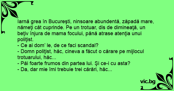Iarnă grea în Bucureşti, ninsoare abundentă, zăpadă mare, nămeţi cât cuprinde. Pe un trotuar, dis de dimineaţă, un beţiv înjura de mama focului, până atrase atenţia unui poliţist.