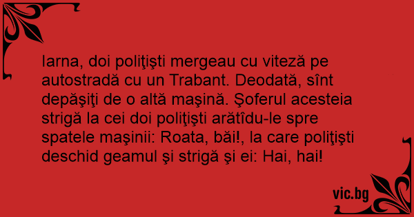 Iarna, doi poliţişti mergeau cu viteză pe autostradă cu un Trabant. Deodată, sînt depăşiţi de o altă maşină. Şoferul acesteia strigă la cei doi poliţişti arătîdu-le spre spatele maşinii: Roata, băi!, la care poliţişti deschid geamul şi strigă şi ei: Hai, hai!