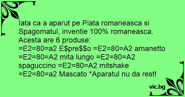 Iata ca a aparut pe Piata romaneasca si Spagomatul, inventie 100% romaneasca. Acesta are 6 produse: =E2=80=a2 E$pre$$o =E2=80=A2 amanetto =E2=80=A2 mita lungo =E2=80=A2 spaguccino =E2=80=A2 mitshake =E2=80=a2 Mascato *Aparatul nu da rest!
