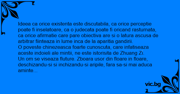 Un om se viseaza fluture. Zboara usor din floare in floare, deschizandu-si si inchizandu-si aripile, fara sa-si mai aduca aminte ca a fost om.