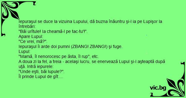 A doua zi la fel, a treia - acelaşi lucru, se enervează Lupul şi-l aşteaptă după uţă. Intră iepurele: