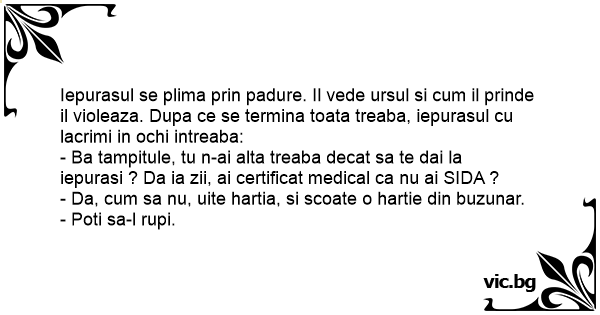 - Ba tampitule, tu n-ai alta treaba decat sa te dai la iepurasi ? Da ia zii, ai certificat medical ca nu ai SIDA ?