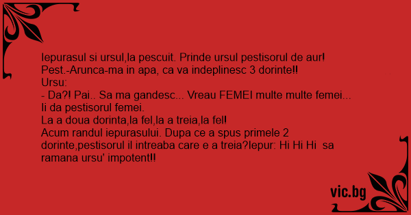 Acum randul iepurasului. Dupa ce a spus primele 2 dorinte,pestisorul il intreaba care e a treia?Iepur: Hi Hi Hi sa ramana ursu' impotent!!
